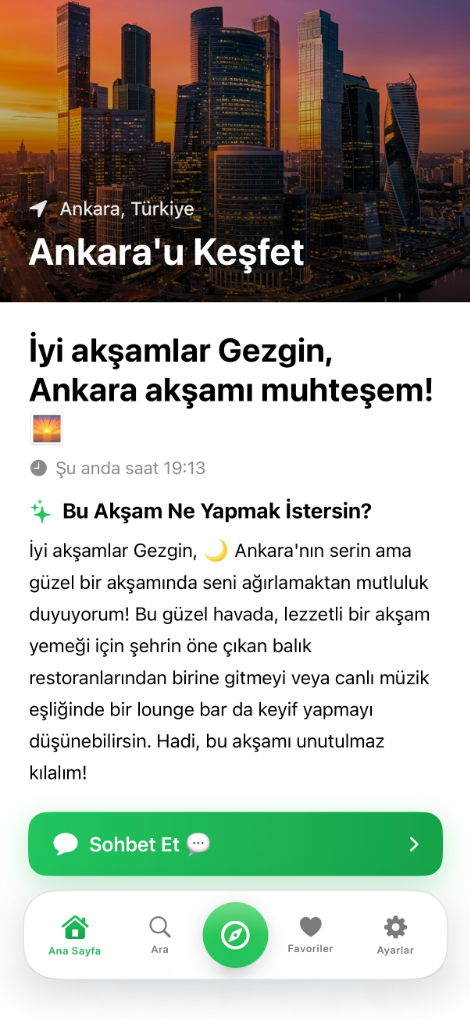 Kararsız kalmayın. Yapay zekamız, o anki saati ve hava durumunu analiz ederek size sabah kahvaltısından gece eğlencesine kadar adım adım bir akış sunar.